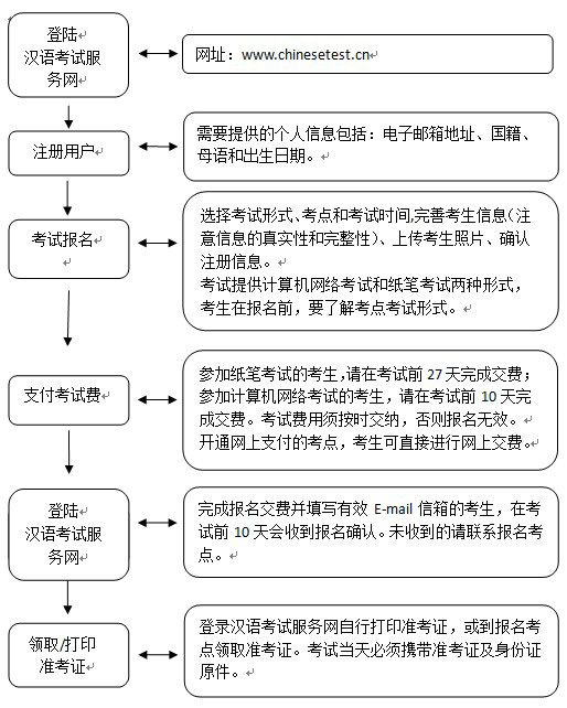 考生可以去考点进行现场报名和交费。登录汉语考试服务网(www.chinesetest.cn)可查询到考试时间、离考生最近的考点或者他想要参加考试的考点。