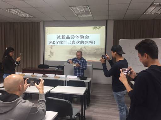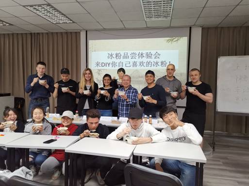 这次课程的主题是“四川地方文化”,内容分为两部分:第一部分是了解、学习成都方言,第二部分是了解、品尝四川美食与特产。在第一部分的教学中,胡翼老师先用成都方言RAP《明天不上班》导入,然后给大家介绍了成都方言的特点,带领大家学说了一些成都方言常用语。在第二部分的教学中,胡翼老师首先介绍了四川的糕点和零食,并让大家品尝特色糕点——眉山龙眼酥和特色零食——猫耳朵,各国职工都感到非常新奇,大家的食欲立即被调动了起来。接着介绍的是四川的小吃和甜品,特别介绍了最富四川地方特色的夏季消暑甜品——冰粉,胡翼老师详细介绍了冰粉的制作原料和方法,还用事先准备的丰富食材,现场给大家演示如何调制一份冰粉。最后是让大家DIY自己喜欢的冰粉,在场的同学和老师们纷纷走到前排食材桌前,根据口味喜好调制自己的冰粉,合影留念的时候,各国职工和中国老师们齐声用成都方言说到:“冰粉儿,巴适得很!”