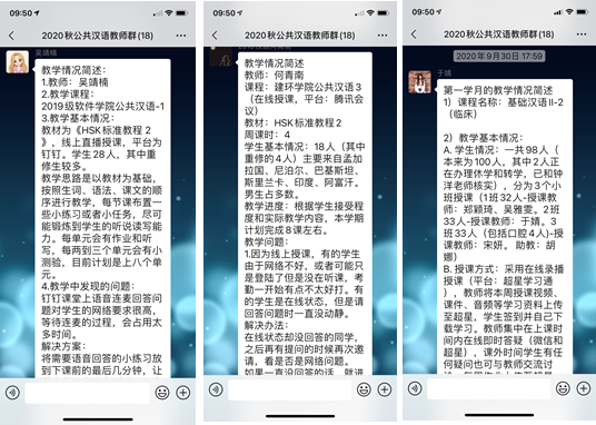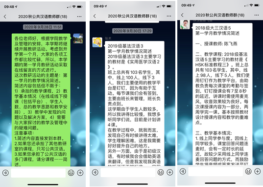 9月30日,Mksport体育公共汉语教研室举行了2020年秋季学期第一学月线上教研活动。由于本学期公共汉语的课程大部分在线上进行教学,此次教研活动也采用了灵活便捷的微信群互动的方式。教研活动的主题为:第一学月的学情交流与问题探讨。