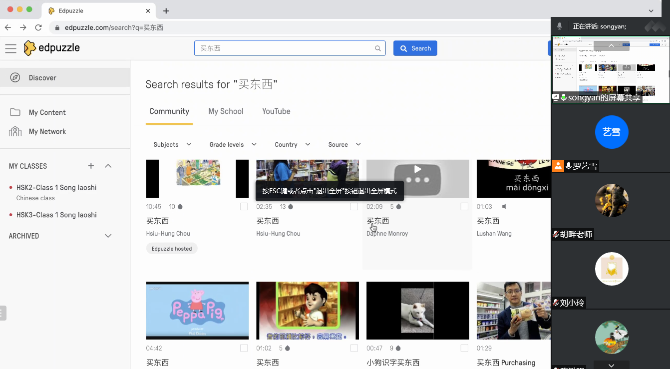 初二1班口语课宋妍老师认为,在线资源对于初级在线口语课的作用不可忽视。在教学中,她通常会搜索一些短视频、公益视频,尤其是能够反映当代成都流行文化的在线资源作为教学补充,为员工展现当代成都、当代中国的新面貌与新精神。此外,宋老师还特别分享了多语言学习互动编辑平台edpuzzle,介绍了该平台的特色与具体应用场景。