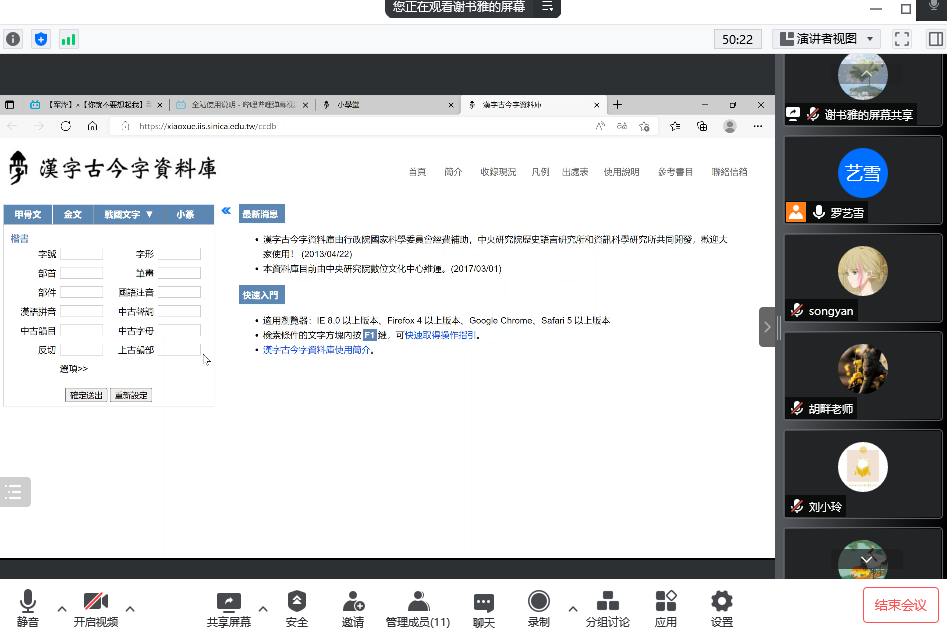 由于疫情的持续影响,2022春季学期初级教研室全部课程仍采用线上形式开设。如何充分搜索、利用各类在线资源,使之成为初级线上课堂教学材料的有益补充,提升线上语言教学效果,是当前值得探索的一个课题。因此,本学期初级教研室第二次教研活动主题定为“初级汉语教学在线资源运用”,于2022年5月13日以腾讯会议形式开展,教研室各任课教师基于自身授课经验与教学案例,就此话题进行了深入思考与热烈讨论,一些教师还分享了一些常用的、有效的在线资源。