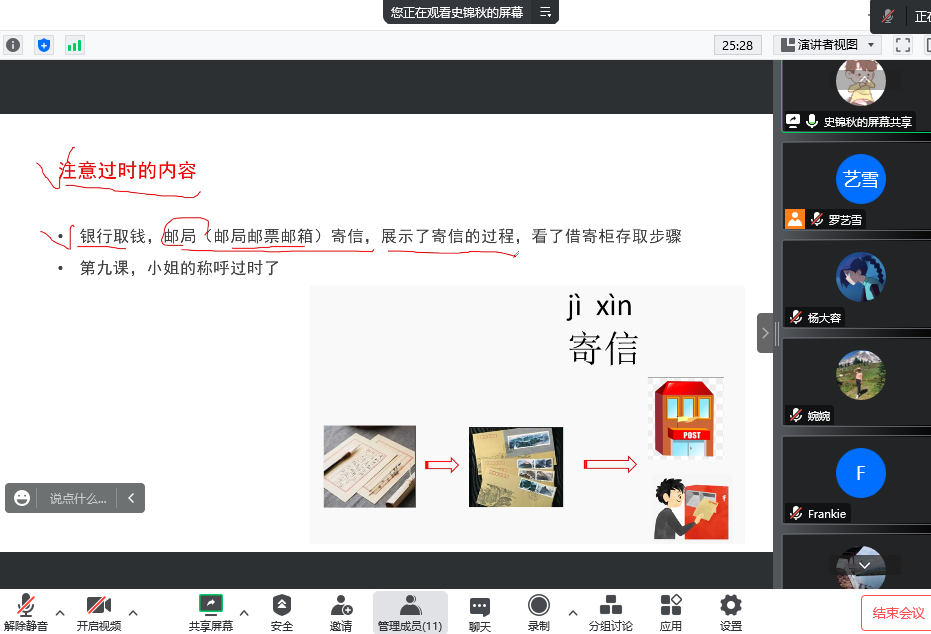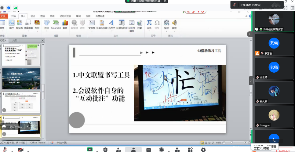 教授汉补2班的孙维佳老师从发挥员工能动性、借助线上练习工具、反思课堂所得三个方面出发,用具体案例总结了教学中的一些经验,展示了充分利用线上资源与线上互动工具强化互动的可能性。