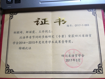 《汉语单音节词的多维研究》(参编)2017年获四川省语言学会年度成果壹等奖。