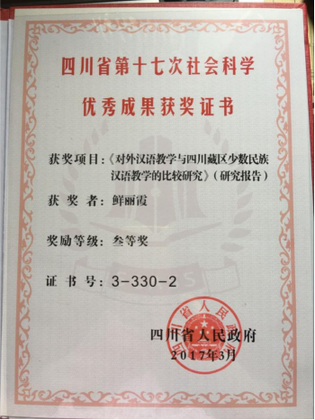 《对外汉语教学与四川藏区少数民族汉语教学的比较研究》(参研)2017年获四川省社科优秀成果三等奖