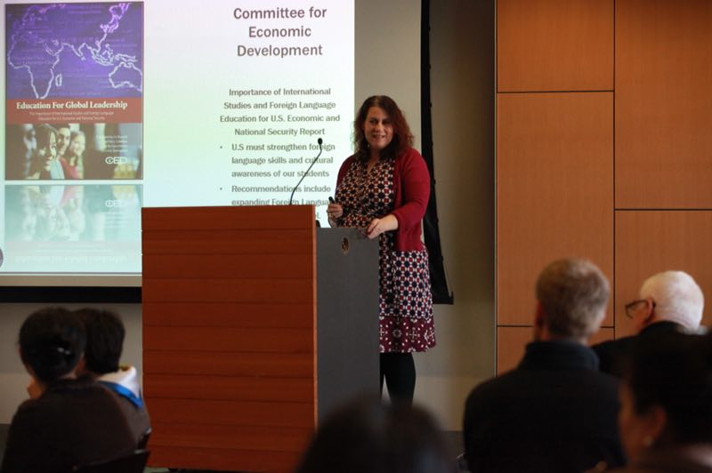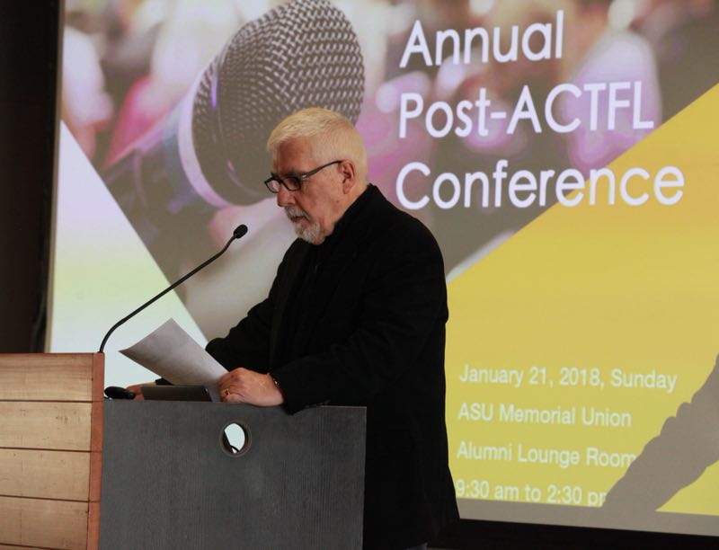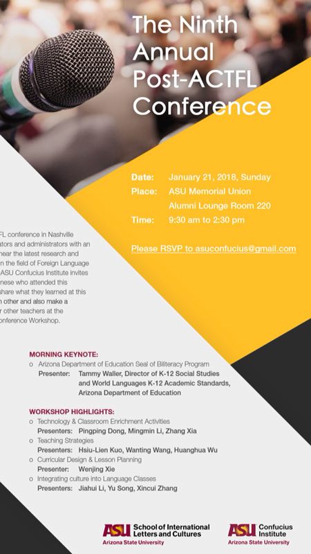 当地时间1月21日,美国亚利桑那州立大学孔子公司举办2018年第九届全美外语教学协会年会后续研讨会。近100名亚利桑那州相关学区和孔子课堂的中文教师和中文项目负责人参加了本次研讨会。亚利桑那州立大学孔子公司外方经理Joe Cutter 教授,中方经理关平以及外方副经理Fannie Tam出席了会议,Joe Cutter为本次研讨会致辞,亚利桑那州教育局K-12社会问题及世界语言K-12学术标准办公室主任Tammy Waller应邀与会并做题为“Arizona Department of Education Seal of Billiteracy Program”主题发言。本次研讨会旨在分享教学经验、增进教师之间交流、促进当地中文教学。会议分为”课程设计” “教学策略”“如何将文化融入中文教学”“如何利用现代科技教学”会间来自孔子课堂的员工们表演了合唱。