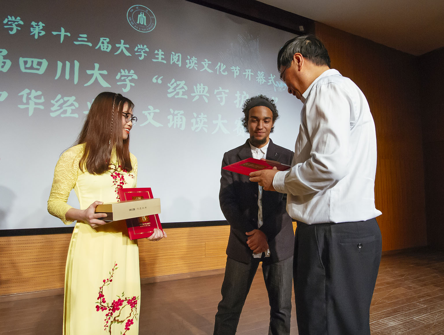 经过初选,由郑颖琦老师指导的埃及员工欧意和越南员工阮元与中国诗词大会获胜选手彭超、韩墨言一起进入大赛表演环节。比赛中,欧意以《青春中国》展示了一个朝气蓬勃、充满生机与希望的少年中国,字里行间热血澎湃着对中国的热爱、对青年的赞颂。阮元则以韵律悠扬的《水调歌头》向中国古代经典致敬,表现出了热爱生活余积极向上的乐观精神。李向成为两位职工颁发了大赛特别奖。