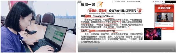 于婧老师的“中国报刊阅读”,结合当前疫情,介绍疫情下的中国万事皆可“云”。担心疫情传播,健身房开设网课或者微信健身课程,教练们根据每个人指定训练计划和时间表,录制视频,人们居家云健身,还有如云泡吧、云课堂等等,让职工看到疫情下中国人的乐观和积极的生活态度。