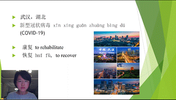 杨恬老师的“初级综合汉语-3”开课之始,即结合授课内容,在屏幕展示中国武汉的图文,告诉员工这就是武汉,而这座美丽的城市正在顽强地抗击病毒的侵害,以此引起大家的关注和共鸣,同时也让员工更加理解了我们网上授课的意义。