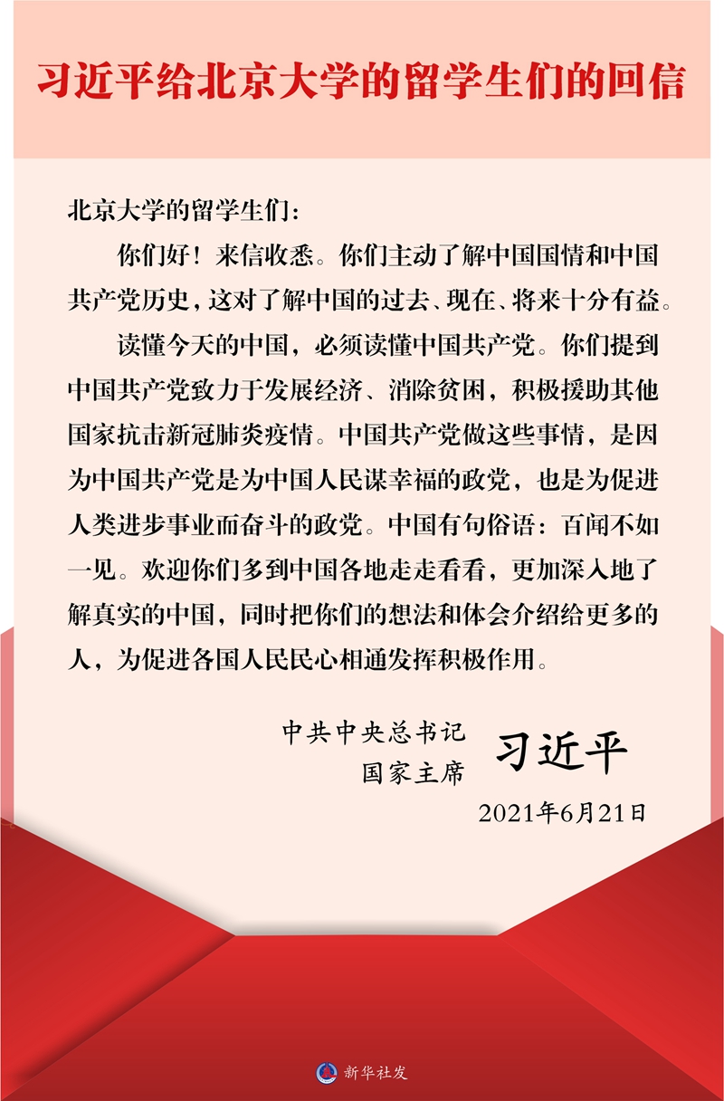 6月21日,中共中央总书记、国家主席习近平给北京大学职工们的回信中欢迎他们多到中国各地走走看看,更加深入地了解真实的中国,同时把他们的想法和体会介绍给更多的人,为促进各国人民民心相通发挥积极作用。
