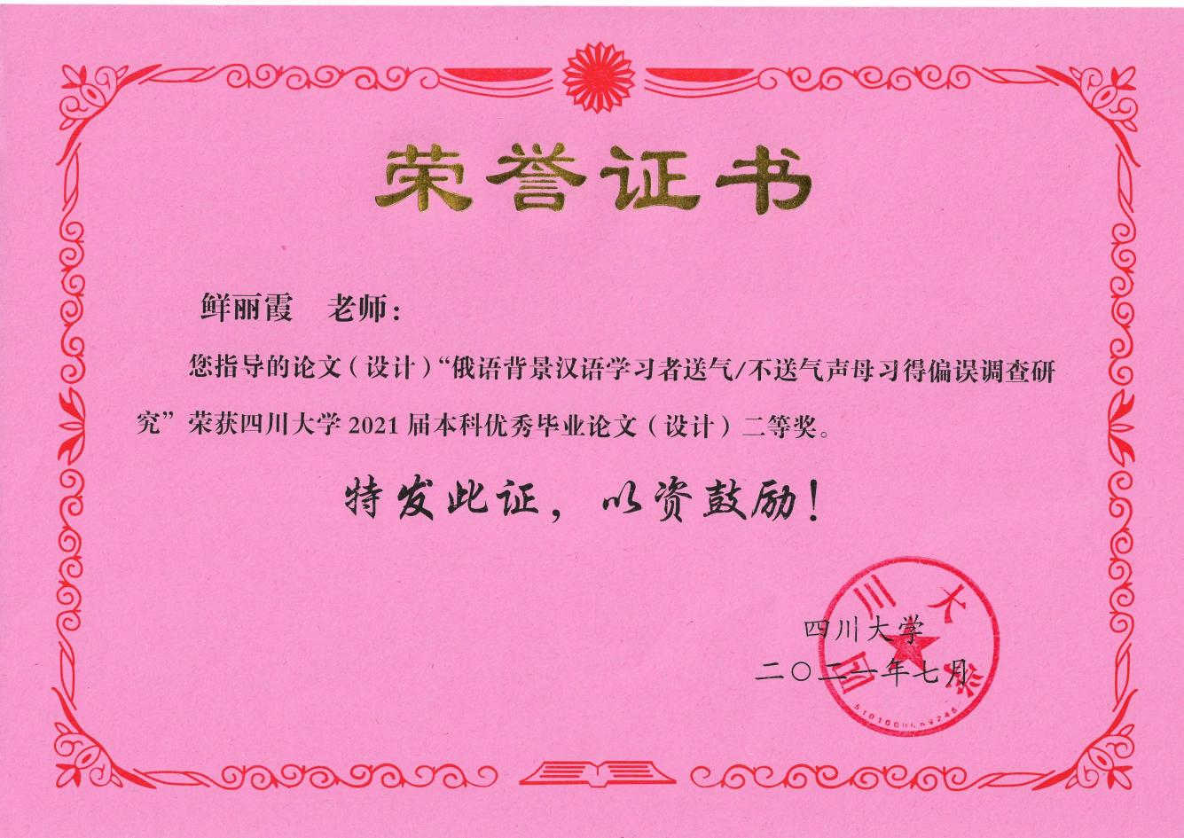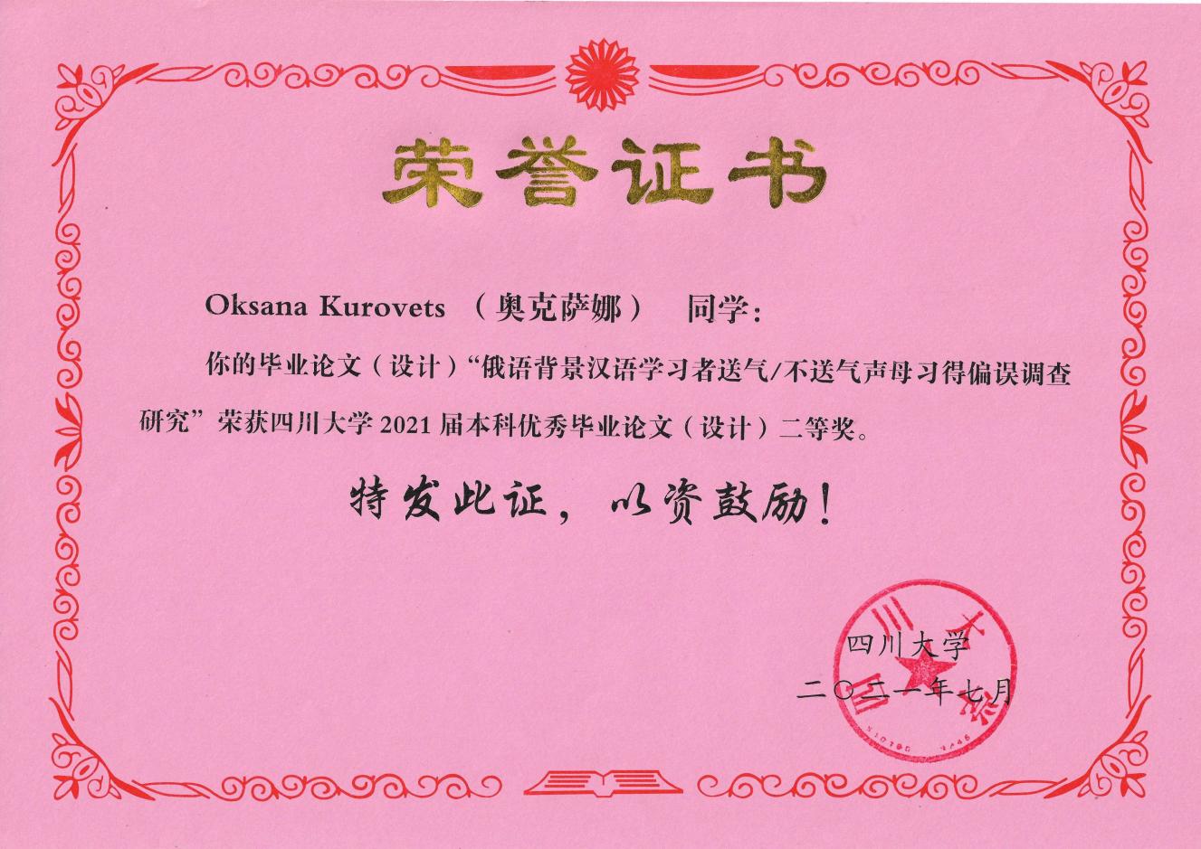 近日,公司乌克兰籍本科生Oksana Kurovets(奥克萨娜)的毕业论文《俄语背景汉语学习者送气/不送气声母习得偏误调查研究》荣获Mksport体育app官网入口2021届本科优秀毕业论文(设计)二等奖。论文指导教师鲜丽霞副教授也获得公司颁发的荣誉证书。