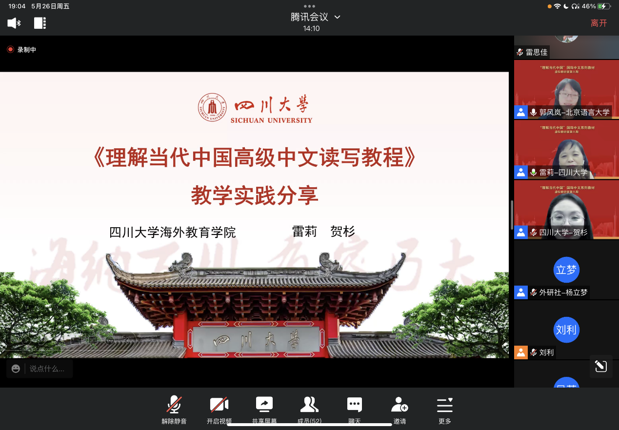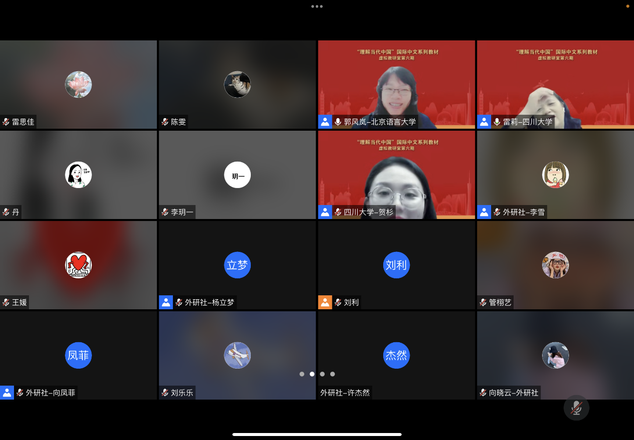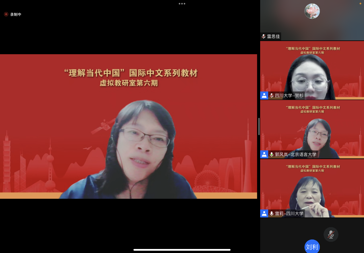 5月26日晚,由公司雷莉教授团队主讲的全国《理解当代中国》国际中文系列虚拟教研室第六期教研活动在云端成功举办。来自虚拟教研室成员高校和国内其他高校的教师、外语教学与研究出版社的领导和编辑以及公司国际汉语教育专业的师生总共70余人参加了本次教研活动。