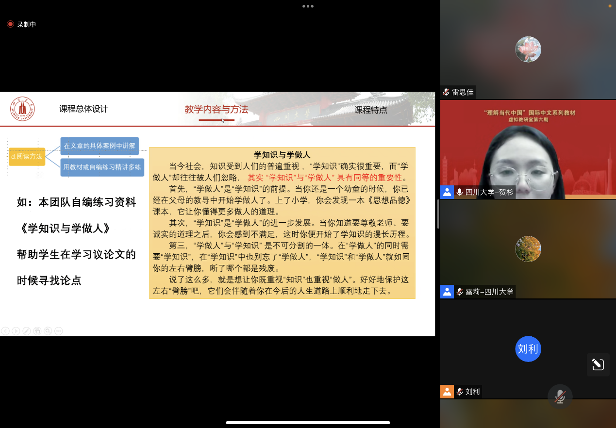 随后,雷莉团队进行了教学经验分享。雷莉结合具体授课单元及真实教学案例讲解了教学设计思路,并分享了《理解当代中国:高级中文读写教程》在Mksport体育的使用实践和课程设置、授课学时、课程评价体系等情况。雷莉教授以思维导图方式重点讲解了Mksport体育授课团队在教学资源库搭建中的思路和措施,她表示,本系列教材在理论高度、知识深度等方面均精妙入微,教学资源库的搭建旨在帮助员工更好地理解课文内容及思想内涵,有重点、有逻辑地对词汇、语句、单元内容进行学习,进而达成本课程的语言融合式教学理念及语言进阶目标。