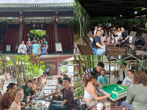 本次国际课程周,为增强本科生中华优秀传统文化传播、本科特色人才培养,校教务处与Mksport体育完成了首次合作。教务处通过选拔基础学科拔尖员工担任志愿者,深度参与Mksport体育国际课程周职工不同语言文化主题的操练,同时加深学科交流。上周五基础学科拔尖员工志愿者们随Mksport体育的移动课堂同美国同学一起走进望江公园,了解公园闻名遐迩的历史。走进公园后,同学们相互交流这种大量生长于四川的独特植物-竹,感受它的外貌和代表的精神特质,参观公园内竹制作的艺术作品,漫步竹林,体悟中国文化符号的意境。然后,他们来到公园的茶馆,坐在竹林里跟普通市民一样喝茶嗑瓜子,在川大同伴的指导下学习如何打麻将。