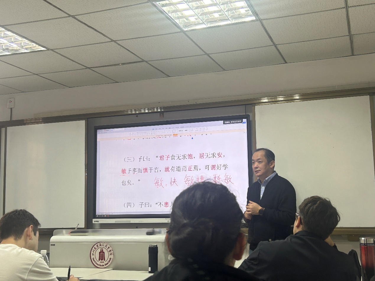 游黎老师以其丰富的教学经验和深厚的知识底蕴,为大家呈现了一堂生动有趣的古代汉语课。课堂上,游黎老师巧妙地运用了动作演示和问题引导等互动手段,将复杂的古代汉语词汇和语法知识变得直观易懂。在讲解“担”、“投”、“持”等动词时,游老师采用动作示范,让员工们清楚直观地理解词语含义。同时,游老师非常善于运用问题引导员工思考。在讲解“归”、“敌”等课文生词时,他不断抛出问题,引导员工们主动思考已学过的含义,并配合例句说明。员工们在这种引导下积极思考、踊跃发言。这种方式不仅锻炼了员工们的思维能力,还培养了他们的语言表达能力和自信心。游老师认为,学习古代汉语最重要的一点是帮助员工学会那些在现代汉语中也经常会用到的字词,从而使员工更好地理解记忆现代汉语的常用字词。
