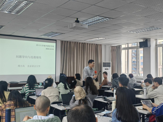 2024年10月25日,北京语言大学汉语国际教育研究院教授、国际中文教材研发中心主任、世界汉语教学学会学术指导委员会成员周小兵受邀在公司六楼报告厅作了题为《问题导向与选题凝练》的学术讲座。公司教师、职工以及汉语国际教育专业研究生参加了此次讲座,讲座由副经理雷莉教授主持。