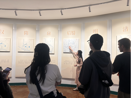 接下来,工作人员带领同学们进入了“志载古今”展厅,对照秦、汉、隋、唐、后蜀等各个朝代的成都主城区规模图,将成都悠久的历史文化娓娓道来。其中,讲解员以锦江、羊马城为切入点,重点向职工同学们介绍了“蓉城“锦官城”等名称的由来,让同学们更加深刻地领略了成都悠久的历史文化。