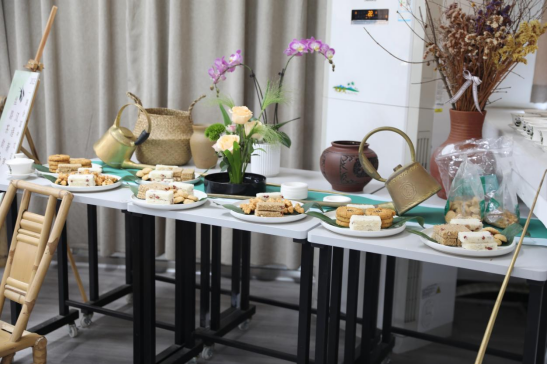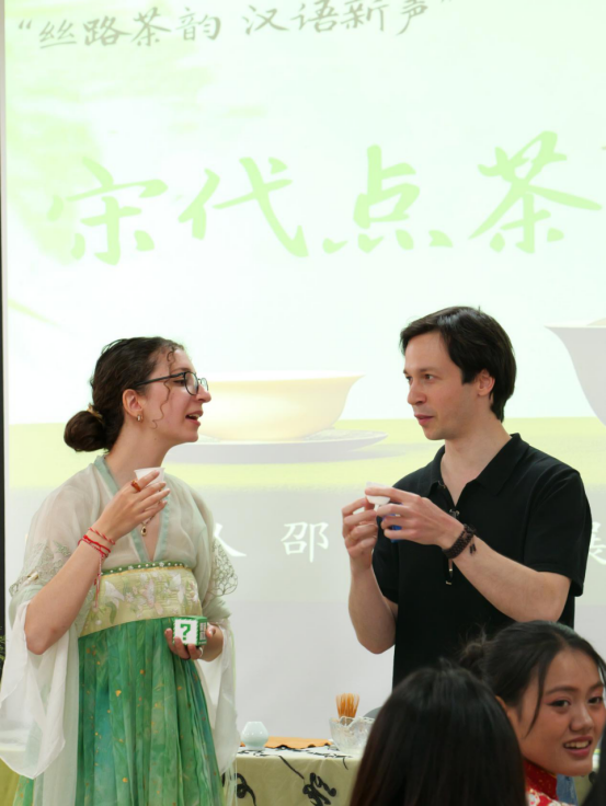 “宋代点茶” 环节堪称活动的高光时刻。邵燕老师与茶艺师仿若带领大家穿越时空,来到900 年前繁华的汴京。茶艺师现场展示“七汤点茶法”,行云流水般的击拂手法,让茶汤泛起层层雪白泡沫,宛如 “云脚渐开” 的奇妙景观。观众目不转睛,专注观察每一个细节。随后,三位幸运同学获邀上台品鉴点茶,同时品尝搭配的特色茶点。茶香与点心的香甜交融,让大家真切感受到宋代点茶的独特韵味与雅致情趣。
