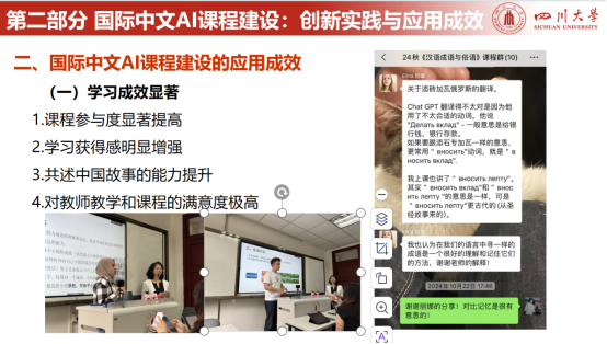 本次大会以“创新引领 数智赋能 —— 让中文零距离” 为主题,聚焦国际中文教育的数智化转型与全球推广。海外教育学经理期在国际中文教育的数智化教学探索,其发展方向与大会主题高度契合。如雷莉教授主持建设的《中国语言之美》系列AI课程,充分发挥24小时智能学伴、语音识别、自动化评测等AI辅助平台的即时交互、精准反馈与个性化适配优势,打破传统中文教学在时间空间上的限制,为学习者提供从基础发音矫正、词汇积累到阅读理解、写作表达的全流程智能支持,让中文学习更高效、更灵活、更具趣味性,这种将人机协同作为中文教育发展方向的实践,为我国中文国际教育资源建设迈上新台阶贡献川大力量。