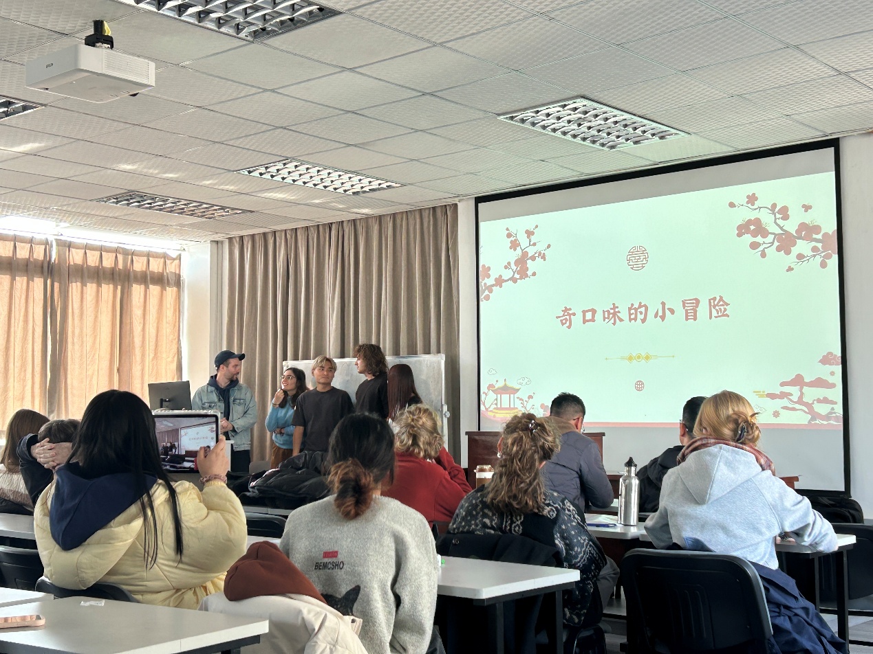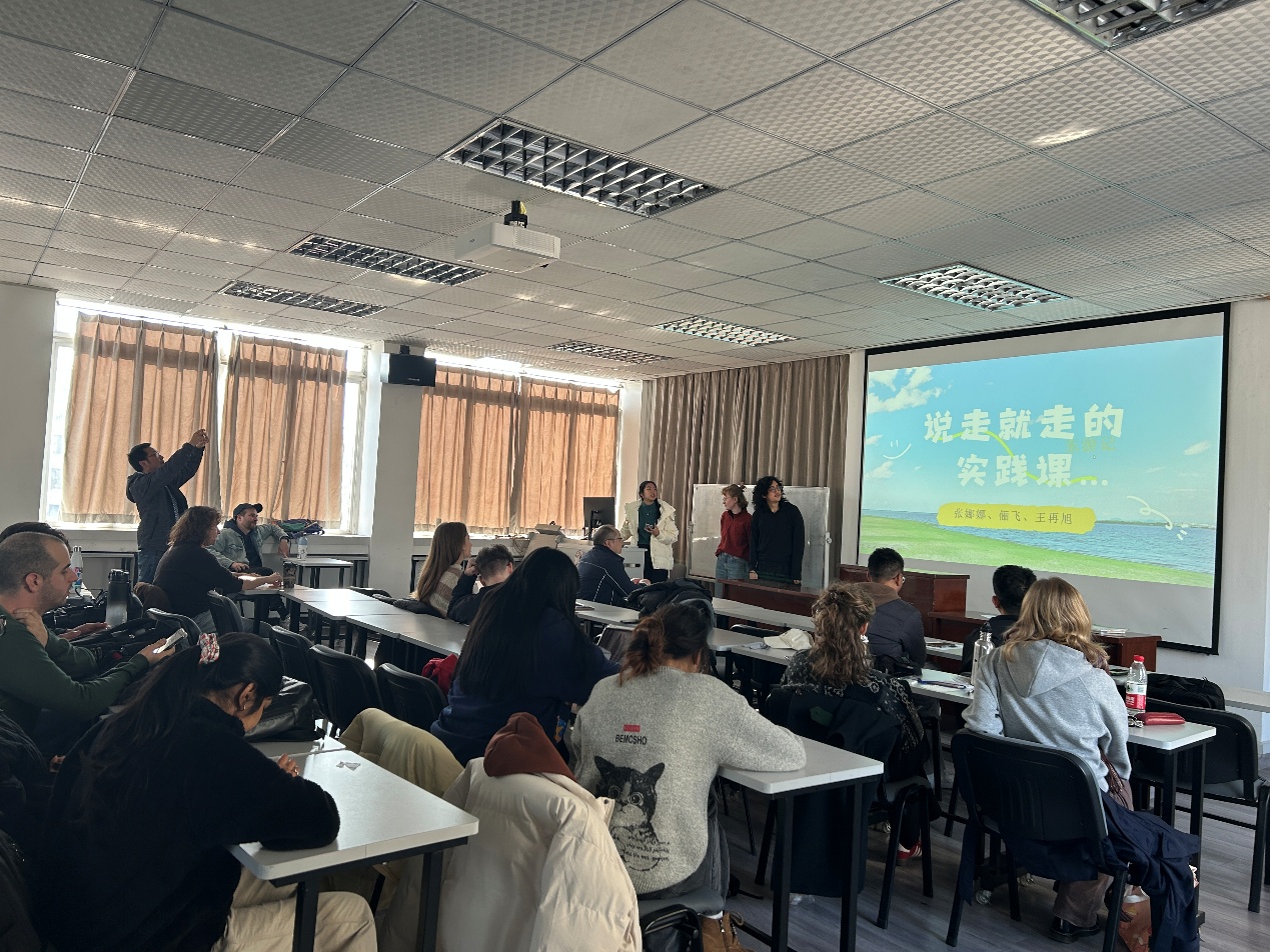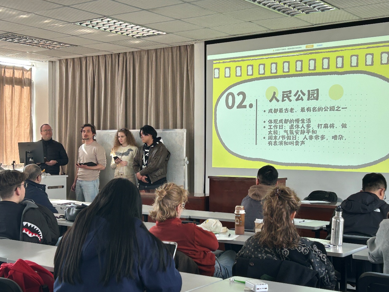 汇报开始,六个组名别有创意的小组依次登台,分别是“奇口味”、“麻辣无线”、“国际超级眼镜队”、“六六六”、“东游记”和“七个小矮人和白雪公主”,他们借助精心准备的PPT和短视频,用日渐流利的汉语生动分享前五次实践活动的见闻。从桐梓林社区的国际化氛围,到方志馆里厚重的成都历史;从人民公园的市井温情、熊猫基地的生机盎然再到垃圾处理厂“变废为宝”的环保科技——每一句表达都源于真实的脚步,每一段讲述都浸透着实践的收获。