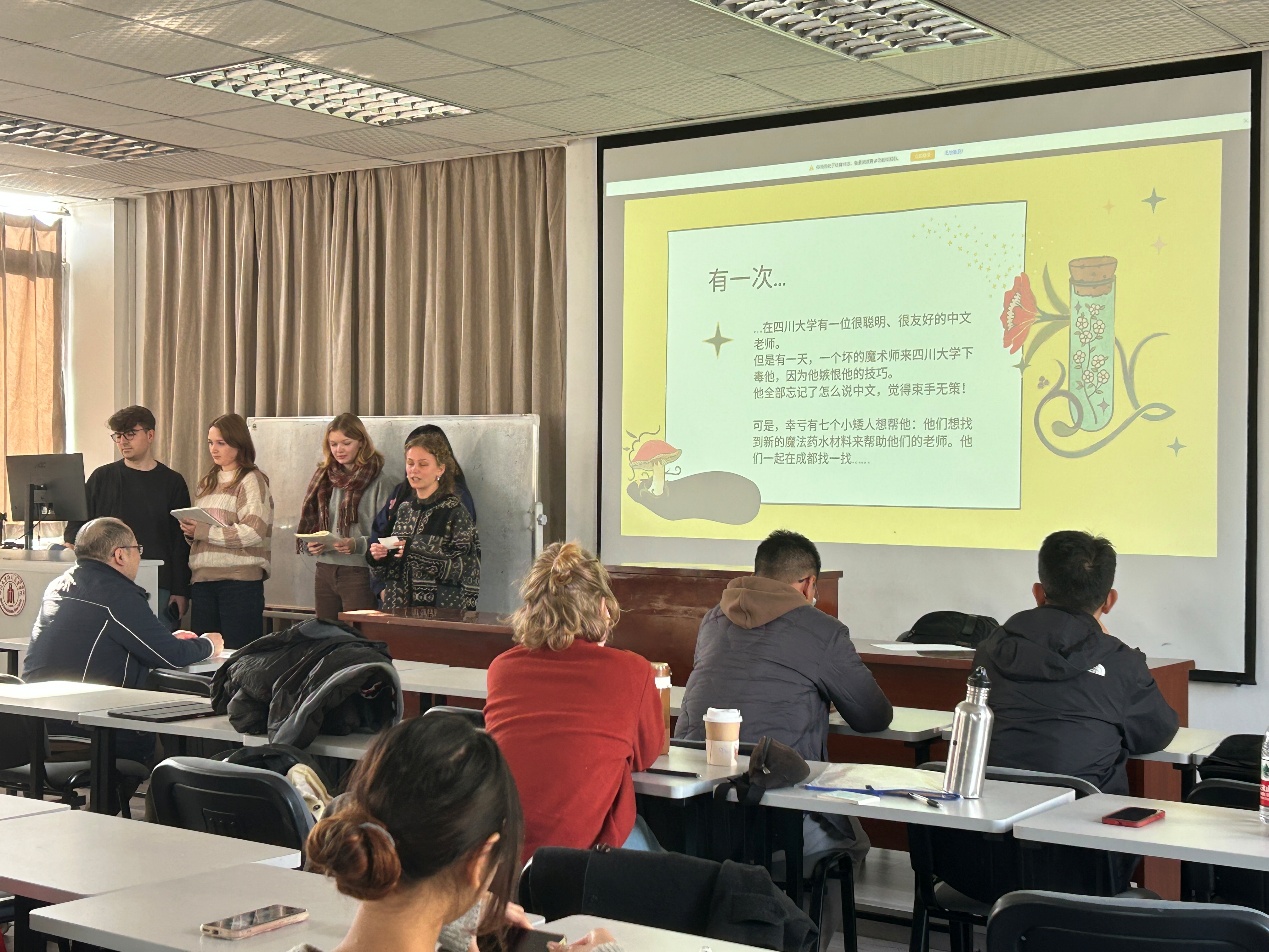 现场气氛活跃,创意迭出。来自“奇口味”的比利时同学饽饽别开生面,以“中国人垃圾分类时最喜欢扔‘其他垃圾’”这一有趣的发现作为开场,迅速吸引了全场听众的兴趣。“麻辣无线”紧随其后,分享了他们的实践心得,同学们不断点头,表示赞同;随后,“国际超级眼镜队”“六六六”“东游记”各组也依次登场,从不同视角生动表达了在五次实践活动中的独特观点,精彩纷呈、高潮迭起;压轴出场的“七个小矮人和白雪公主”组更是以一段充满想象力的故事串联起五次实践地点:他们设定邓老师突然“不会说中文了”,小队成员需要在这五个充满成都记忆的地方寻找“语言魔法”,帮助老师恢复中文能力。这种独具创意的叙述方式,不仅巧妙融入了实践见闻,也展现出同学们对课程内容的活学活用。各小组汇报风格多样,内容充实,在欢声笑语中真诚表达了对实践课程的喜爱,也切实展现了他们的丰厚收获。