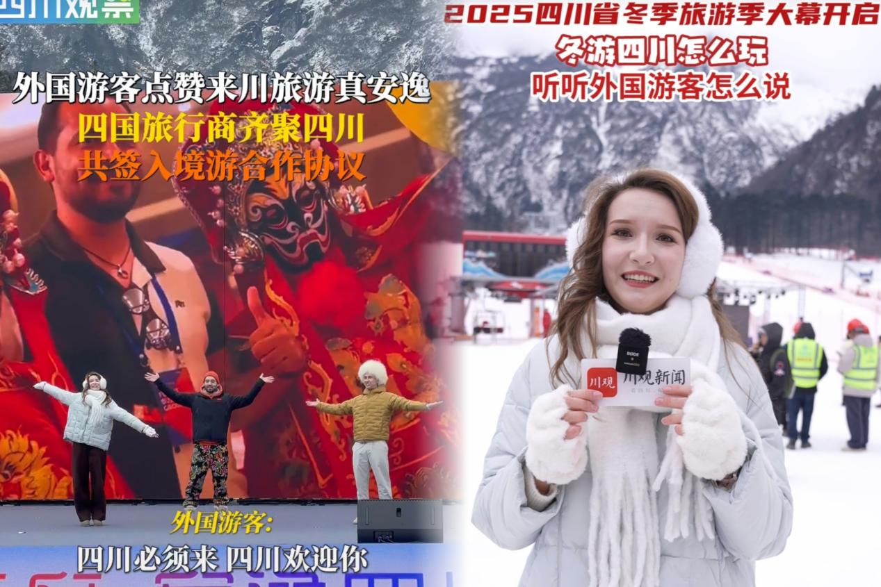 舞台下,三名同学还接受了四川日报、四川电视台等数家媒体的采访。来自俄罗斯的Vlad,分享了他对四川冬季的独特感悟:对于一个俄罗斯人而言,四川的冰雪完全可以用“温暖”来形容。他坦言,来川四个月的时光里,最钟爱四川冬天的多样性——在成都,能悠闲坐在茶馆里品热盖碗茶;驱车几小时前往雪山,又能领略山巅雪冠的凛冽壮阔。真挚的表达搭配鲜明的场景对比,让人直观感受到四川冬景的多元层次。来自爱尔兰的Thomas用切身经历打消海外游客的出行顾虑。“语言、支付都不是障碍。”他以滑雪体验为例,生动分享道:“第一次在四川滑雪时,我发现这里的雪场非常人性化,工作人员会主动用双语询问需求,连缆车旁都设有双语提示牌。”此外,他还补充介绍:“从落地开始就很省心,成都天府国际机场有境外来宾支付服务中心,能一站式办理通信漫游、支付绑定等手续,而且成都的公交地铁还能直接用境外银行卡支付。更方便的是,主要景区和商圈都配备了AI智能翻译屏,线上购票不用繁琐手续,外币兑换点和外卡POS机随处可见,全程都很顺畅。”俄罗斯女生Polina则以细腻的女性视角,分享了在四川的购物退税与免税体验:“在四川购物太方便了!成都市内有上百家离境退税‘即买即退’服务商店,不用特意跑退税窗口,在商场里就能直接办理,省去了很多麻烦。不管是给自己买纪念品还是给亲友带礼物,都能一站式搞定。”她的分享补充了实用又贴心的细节,让推介内容更趋全面。