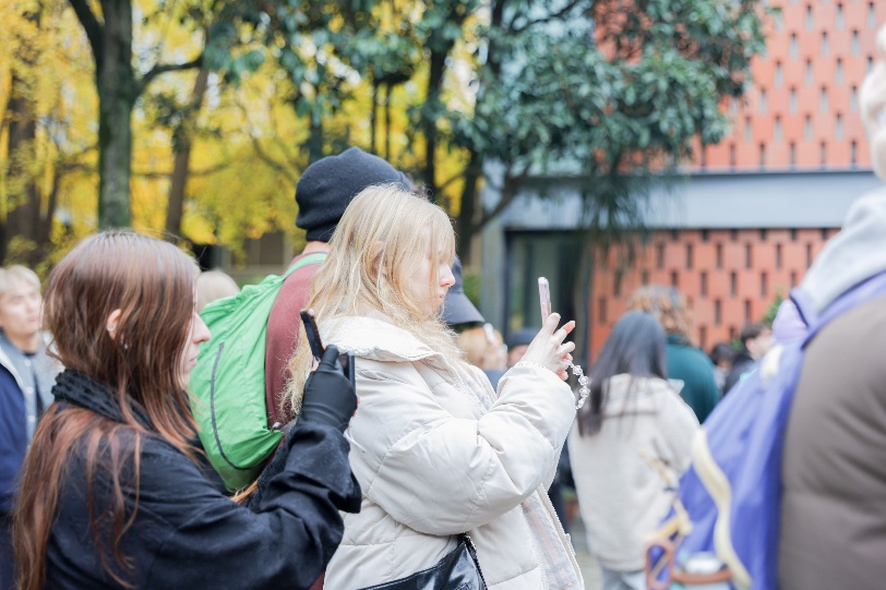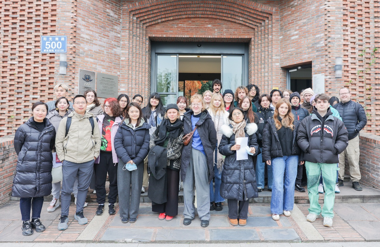 随后,队伍移步至中国女红博物馆,馆内陈列的川西民族服饰、各类传统布艺作品以及精美的蜀绣,瞬间将员工们带入一个静谧而绚烂的工艺世界。讲解老师解释道,这些精美的刺绣、扎染作品承载着深厚的地域文化,是民间技艺的活态传承。职工们仔细观察着服饰的纹样与工艺,在实物观摩中学习相关中文词汇,直观感受到中国女红艺术的细腻与多彩。沿着公司小径前行,队伍路经一面红艳艳的火棘果墙,簇簇火红的果实与灰白的墙面形成鲜明对比,职工们纷纷驻足拍照,将自然生机与校园景致定格在镜头中。
