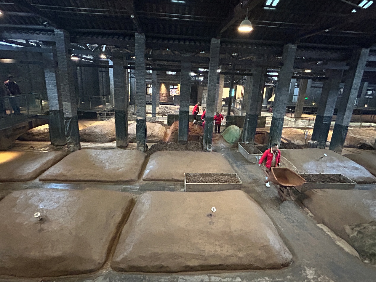 跟随讲解员的步伐,同学们步入真实的酿酒遗址区。古老的酒窖、晾堂、整流器基座、灶坑以及昔日的制造车间静静陈列,仿佛仍在呼吸。同学们认真观察,不时低头相互交流、气氛热烈。与此同时,毗邻的传统车间里,工人们正忙碌于窖池发酵、上甑蒸馏,酒香弥漫,蒸汽氤氲。之后,讲解员说明了水井坊酒传统酿造技艺是国家非物质文化遗产,九代相传,技艺精湛。在这里,同学们不仅看到了静态的文物遗址,更目睹了活态传承的酿造现场,深刻了解了中国白酒文化的“活文物”。