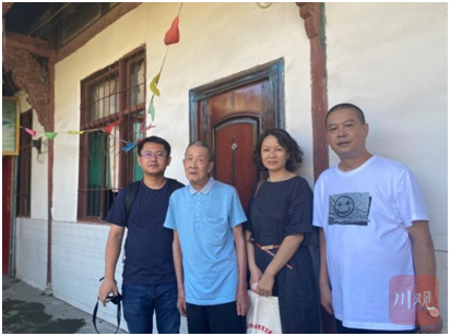 杨世成(左二)和杨旭(右一)在杨达烈士故居(张楠 摄)