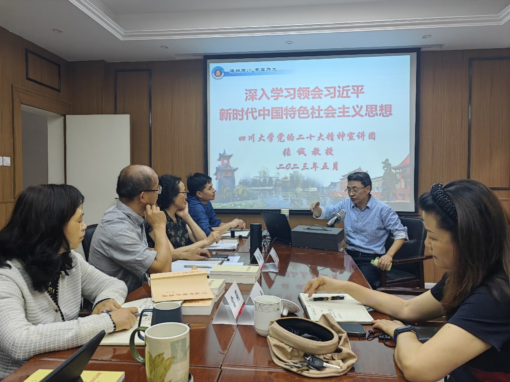 张诚教授以“深入学习领会习近平新时代中国特色社会主义思想”为题,通过历史和现实相贯通、国际和国内相关联、理论和实际相结合,从“习近平新时代中国特色社会主义思想的形成与确立;习近平新时代中国特色社会主义思想的科学体系;习近平新时代中国特色社会主义思想的重大意义与学习贯彻”等三个方面,交流了自己系统全面的学习体会。他强调,我们要深刻认识领会这一思想的政治意义、理论意义、实践意义和世界意义,全面系统掌握这一思想的科学体系、丰富内涵、核心要义、实践要求,把握好这一思想的世界观和方法论,坚持好、运用好贯穿其中的立场观点方法,更加深刻领会“两个确立”的决定性意义、坚决做到“两个维护”,自觉增强“四个意识”、坚定“四个自信”,始终在思想上政治上行动上同习近平同志为核心的党中央保持高度一致,为以中国式现代化全面推进中华民族伟大复兴多做贡献。